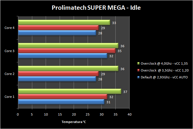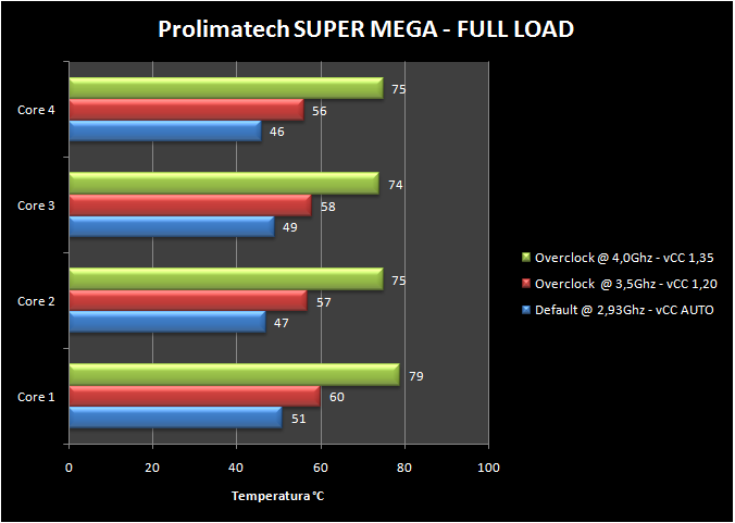 Il SUPER MEGA, come si evince dai grafici sottostanti, ci ha consentito di raggiungere ottimi risultati in overclock con temperature superbe, dobbiamo infatti considerare che la nostra piattaforma di test è composta da un processore (Intel 875K) dotato di Hyper Threading, il quale, notoriamente risulta essere particolarmente esoso in termini di calore profuso. Cionostante come possiamo vedere in full-load @ 4000mhz e con la ventola Vortex a pieno regime di rotazione (1000rpm) raggiunge ‘solamente’ 79°. Queste temperature possono essere ulteriormente abbassate con l’utilizzo di una ventola con un regime di rotazione più elevato. Facciamo notare infine che con dissipatori di fascia inferiore ci è stato impossibile raggiungere la stabilità operativa a 4Ghz. Quindi, considerando, il nostro sistema di prova, i risultati ottenuti risultano veramente ottimi.