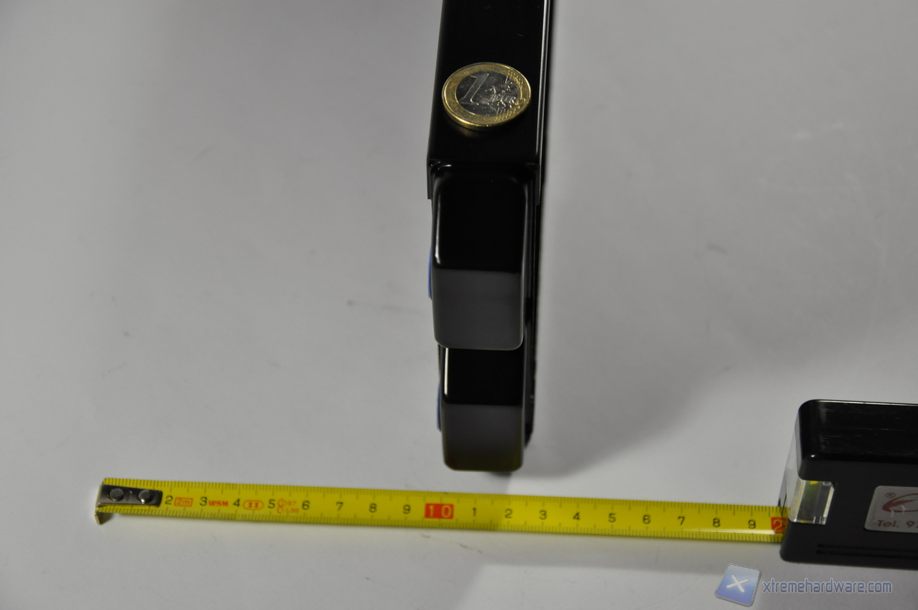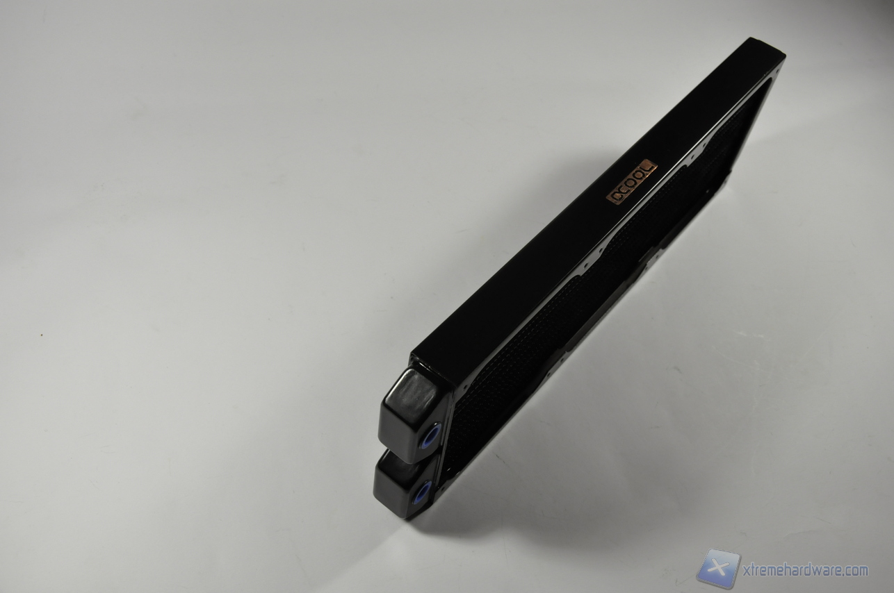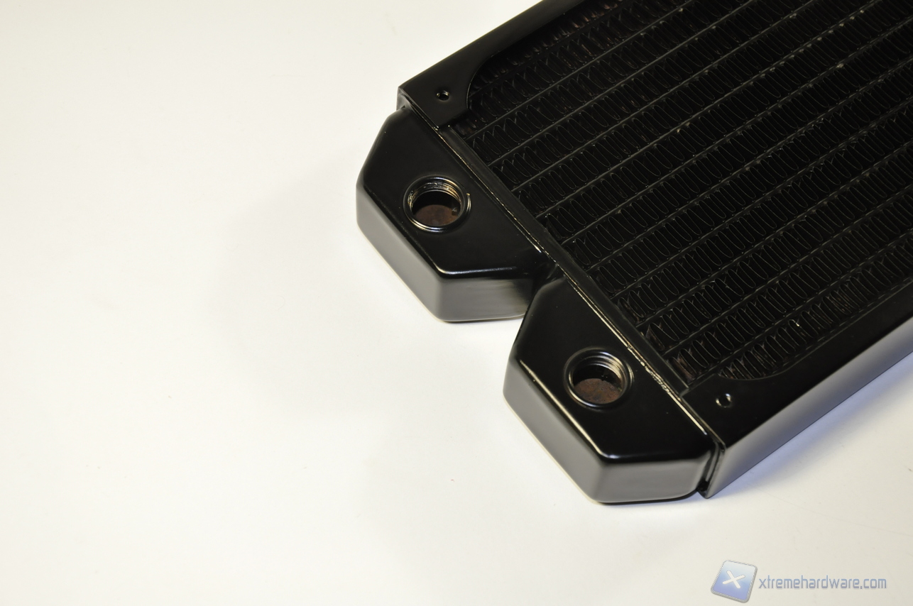 Uno dei punti forte a prima vista del NexXxos ST30 Full Copper Radiator 360 è la dimensione, con uno spessore estremamente contenuto, di soli 30 mm. Il ridotto spessore, pur massimizzando gli spazi dove allocarlo, non deve far pensare alla fragilità, tutt’altro. Il radiatore è avvolto esternamente da una fascia di acciaio che funge da telaio, con tanto di bordo ripiegato internamente. La sua funzione è di proteggere il radiatore dalle viti nel caso esse penetrino troppo internamente danneggiando le alette ed i canali. I due fori da ¼” per il passaggio del liquido sono chiusi da due tappi in silicone, onde evitare che il rame, materiale con cui è composto il radiatore, si ossidi.