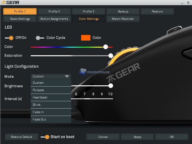 Nella parte alta troviamo i 5 Profili che potremo personalizzare da tale software di gestione e alcune voci che ci permetteranno di effettuare un Backup, un Restore dei profili salvati, un ripristino ai parametri di fabbrica in caso di problemi e i classici tasti per confermare o meno le modifiche.