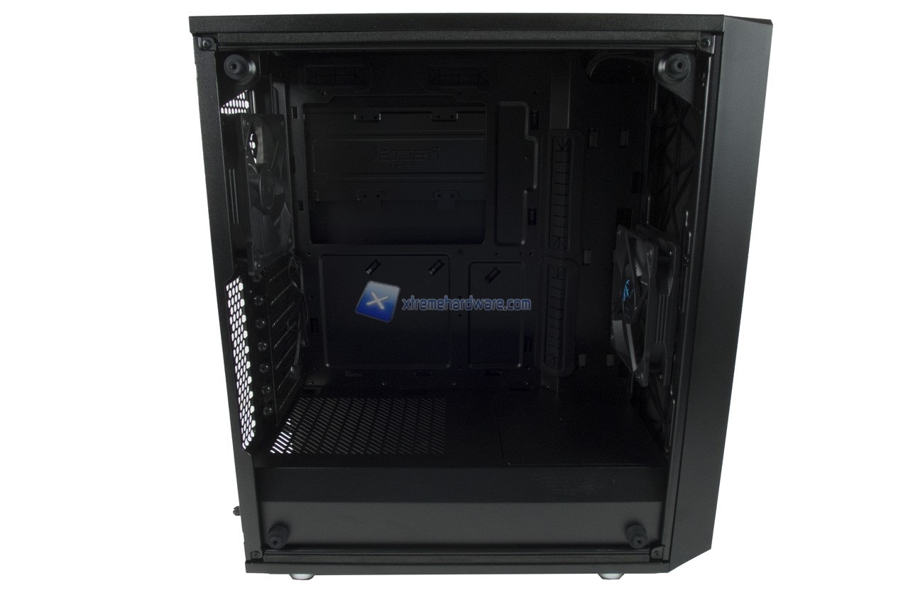 Frontalmente ritroviamo la prima delle due ventole preinstallate e la possibilità di vedere l’inserto antipolvere del pannello frontale. Nel lato inferiore troviamo anche un coperchio che rimosso preventivamente insieme al Cage degli Hard Disk da 3,5’’ permetterà di installare un AIO o radiatore da 360 mm anche in configurazione Push/Pull. Avremo a disposizione ben 12 cm compresa la o le ventole installate.