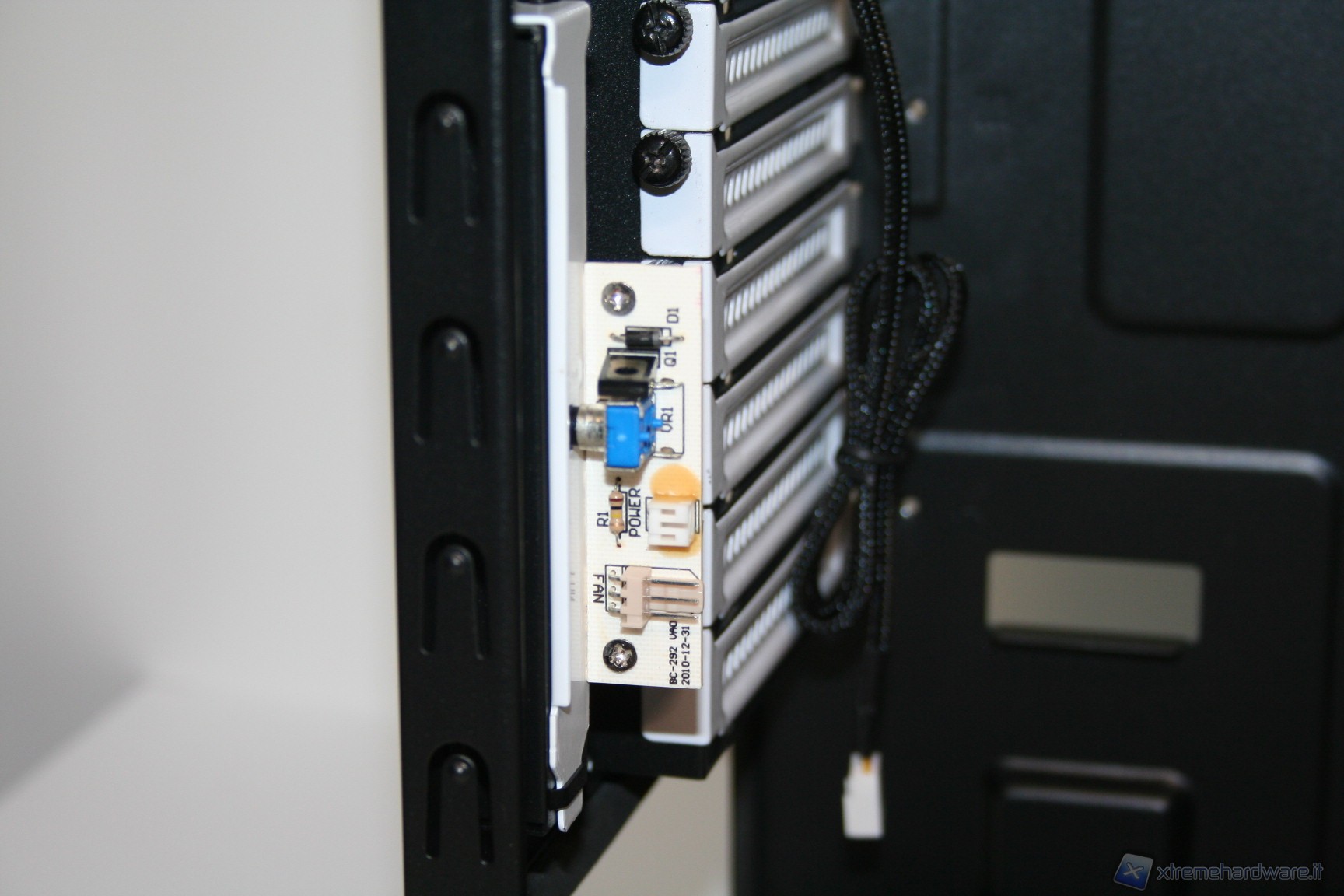 Particolare menzione va al sistema di controllo delle ventole fornito in bundle, che secondo quanto riportato nel manuale andrebbe montato nell'apposito slot PCI laterale. Come detto, consigliamo invece di montarlo nel primo slot PCI vicino alla ventola da 140mm posteriore, al fine di nascondere i cavi dietro all'apertura della scheda madre. Terminata l’operazione vi consigliamo di connettere tutte le ventole del cabinet, che potrete cablare direttamente dietro alla paratia di installazione della scheda madre vicino all'apertura posteriore della CPU. Fatto questo bisogna connettere le ventole del dissipatore, i cavi SATA, di alimentazione delle varie periferiche ed infine quelli sulla scheda madre. Di seguito le foto del Fractal Arc a lavoro terminato. Al fine della misurazione riportiamo il posizionamento del sensore di temperatura, posizionato direttamente sopra la i due cage dell'hard disk.