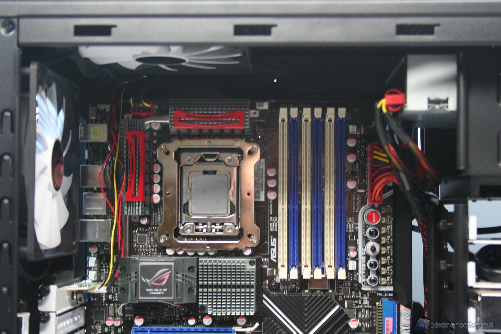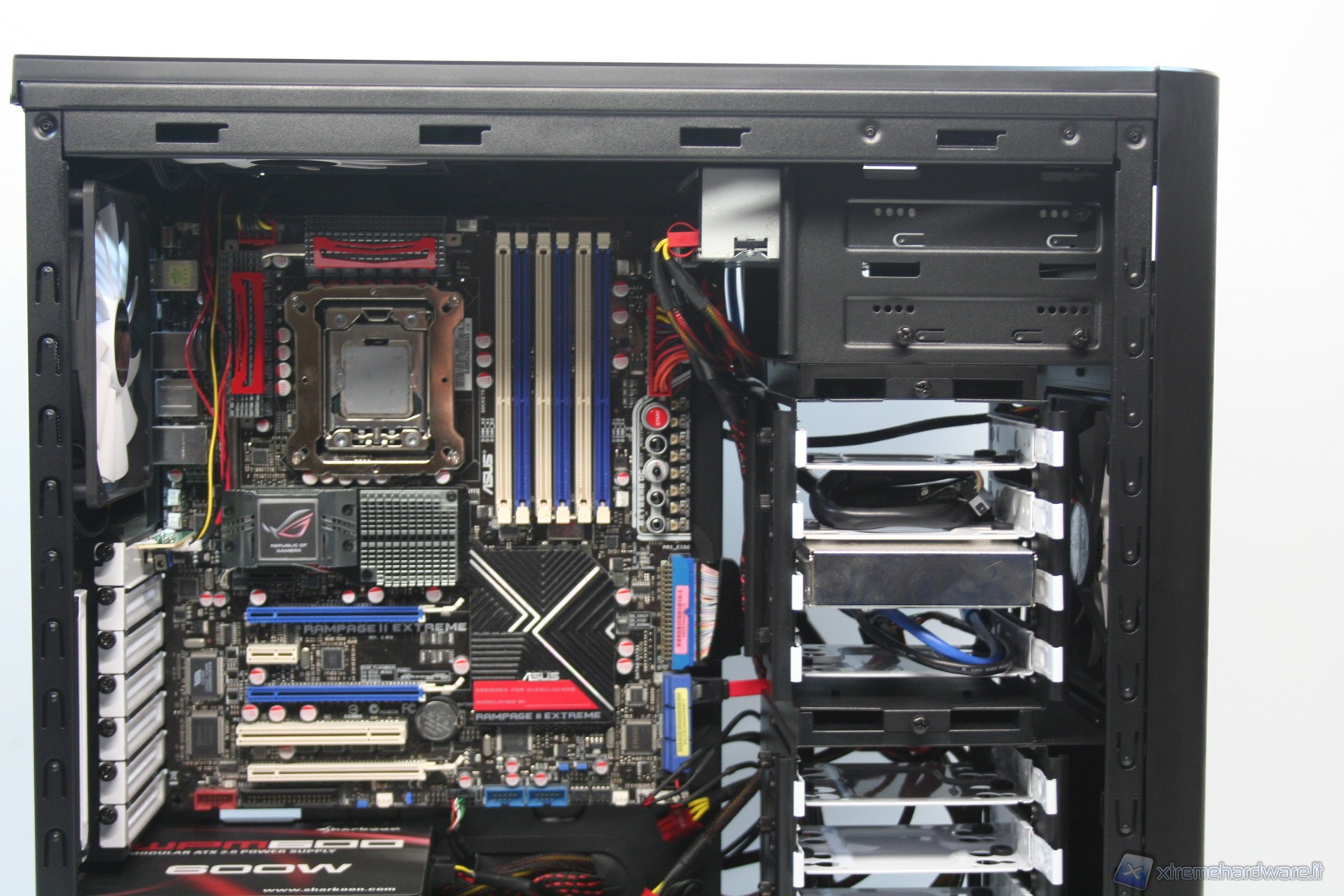 In questo paragrafo analizzeremo il montaggio all’interno del Fractal Arc di un sistema Intel con socket X58, assieme al conseguente cablaggio delle varie componenti. Anche per gli utenti poco esperti la procedura è molto facile: per prima cosa dovrete montare l’alimentatore alla base del cabinet, facendo attenzione a passare il connettore di alimentazione supplementare della scheda madre, da 4/8 pin, attraverso l’apertura laterale destra, quindi facendolo scomparire e passare dietro alla paratia, per permetterne il passaggio dal foro superiore sinistro. Fatto questo consigliamo l’installazione dei dischi rigidi all'interno del cage inferiore, utilizzando di viteria dedicata direttamente nelle aperture predisposte con profili gommati antivibrazione. Fatto questo sarà necessario montare il lettore ottico, staccando la parte frontale facendo pressione verso l'esterno, partendo dalla base. Successivamente si passerà all’installazione della scheda madre. Se si possiede un dissipatore Intel, tramite il solito sistema push-pin, sarà possibile installarlo successivamente, altrimenti se volete potete già procedere ad installare il backplate del dissipatore della CPU, facendo attenzione a stendere un sottile velo di pasta termica alla base della CPU stessa e posizionando lateralmente il cabinet. Questa è la procedura classica, altrimenti potrete semplicemente montare la scheda madre e sfruttare l'apertura posteriore del cabinet. Dopo aver montato il dissipatore sulla scheda madre, sarà necessario montare la scheda video, le RAM ed infine procedere all’assemblaggio dei cavi di connessione del cabinet alla scheda madre. Per fare un lavoro pulito consigliamo l’utilizzo delle fascette restringenti fornite in bundle. Nelle foto potete valutare la situazione dei cavi nel vano retrostante alla scheda madre, di spessore elevato in modo da facilitarne l’alloggiamento.