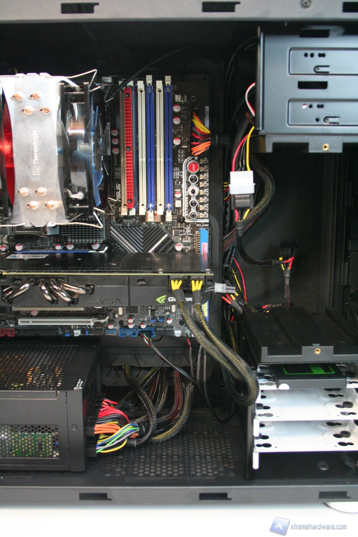 Particolare menzione va al sistema di controllo delle ventole fornito in bundle, che secondo quanto riportato nel manuale andrebbe montato nell'apposito slot PCI laterale. Consigliamo invece di montarlo nel primo slot PCI vicino alla ventola da 140mm posteriore perché così facendo questa è l'unica soluzione che permette di nascondere i cavi dietro all'apertura della scheda madre. Purtroppo nella configurazione consigliata i cavi sono troppo corti, e fondamentalmente sarebbe anche antiestetica. Terminata l’operazione vi consigliamo di connettere tutte le ventole del cabinet, che potrete cablare direttamente dietro alla paratia di installazione della scheda madre vicino all'apertura posteriore della CPU. Fatto questo bisogna connettere le ventole del dissipatore, fare un check dei cavi Sata, di alimentazione delle varie periferiche ed infine quelli sulla scheda madre. Ecco qui come si presenterà il case a lavoro terminato. Al fine della misurazione riportiamo il posizionamento del sensore di temperatura, posizionato direttamente sopra ai due cage degli hard disk.